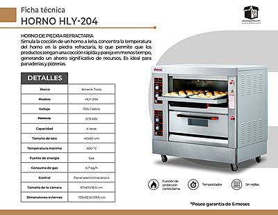- Cuenta con quemadores independientes en la parte inferior y superior, para regular de forma independiente la temperatura superior e inferior de la cámara de cocción.