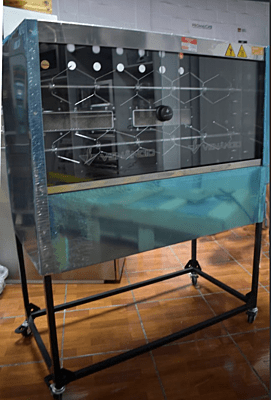 Asador para Pollos SFG1 de Venancio es un equipo robusto y eficiente, diseñado para funcionar tanto con gas como con electricidad. Fabricado con un acabado externo en acero inoxidable, este asador cuenta con dos quemadores de gas infrarrojos que, junto a sus pinchos giratorios, garantizan una cocción uniforme de los alimentos. Con dimensiones de 1260 x 900 x 460 mm y un peso de 62 kg, es adecuado para su uso en restaurantes, comedores, tiendas de conveniencia y supermercados. El consumo de gas es de 0.480 kg/h, mientras que su motor eléctrico tiene una potencia de ¼ de caballo de fuerza y un consumo de 0.19 kWh. Este asador está equipado con ruedas de bloqueo para facilitar su movilidad y pinchos con ganchos dobles y simples, esmaltados al fuego para mayor durabilidad. Es la opción ideal para preparar pollos de manera eficiente y con un acabado