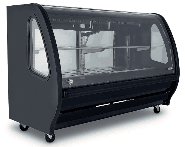 Vitrina color negro de 1.887 m, 2 niveles de exhibición, puertas posteriores de cristal, techo de acero inoxidable. 4 charolas de acero inoxidable con inclinación variable Dos puertas traseras corredizas de vidrio desmontables Iluminación interior con LED Control digital de temperatura 2°C a 10°C Dimensiones exteriores: Alto: 117.5cm, Ancho: 188.7cm, Profundo: 73.03 cm Volumen utilizable: 792 lts. Potencia de compresor: 1/3 HP / 382 Watts Fuentes de alimentación:115V/60HZ Amperaje: 7.86 A Consumo: 6.71 KW/24HRS
