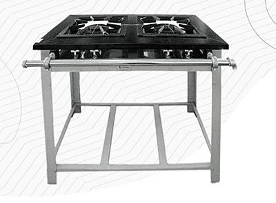 Cocina tipo fogón de 2 quemadores dobles de hierro fundido, 180mm con potencia hasta 5.586 kcal/h). Parrilla de hierro fundido de 40x40cm reforzada. Cuerpo y mesa en acero al carbono súper resistente, en pintura electrostática en polvo, con base fosfatada.