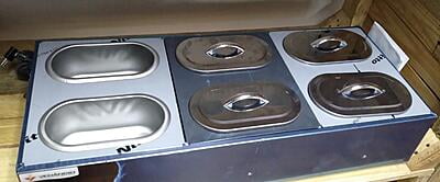 La Salsera Eléctrica M3E6CP, construida en acero inoxidable, está diseñada para mantener salsas a temperaturas altas de manera eficiente. Este equipo funciona con un voltaje de 120V y está equipado con dos resistencias de 300W cada una, lo que le permite un consumo de 0,60 kW/h. Sus dimensiones son de 250 mm de alto, 885 mm de largo y 412 mm de fondo, y cuenta con 6 cubas pequeñas de 235 x 125 x 80 mm, todas fabricadas en acero inoxidable y sin necesidad de agua para su operación. Es ideal para su uso en taquerías, negocios de tortas, hamburgueserías, pupuserías, y restaurantes, asegurando que las salsas se mantengan a la temperatura ideal durante el servicio.